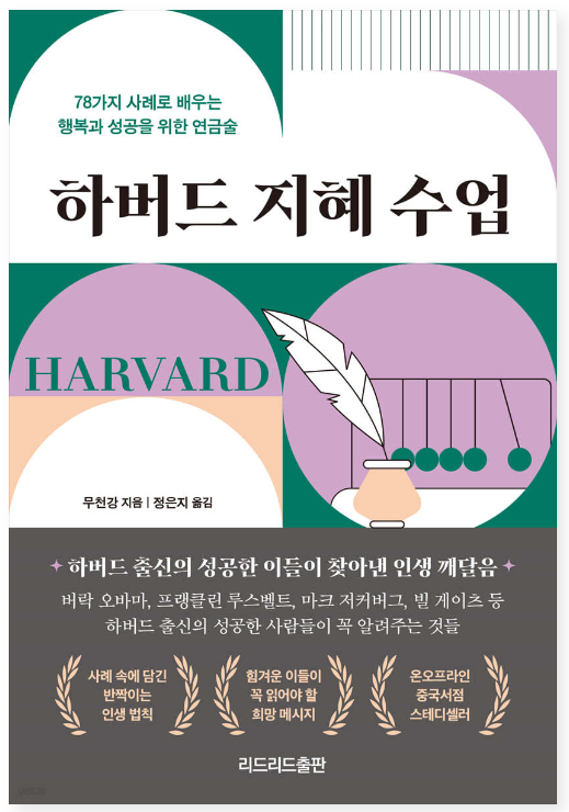 오늘 소개해드릴 책은 하버드 지혜 수업이라는 책입니다. 무천강 지음, 리드리드 출판에서 나온 책입니다. 이 책은 행복한 인생, 성공한 인생, 풍요로운 인생을 살아갈 수 있도록 총 10개의 파트로 구성하여 삶의 지혜를 선물하는 책입니다.